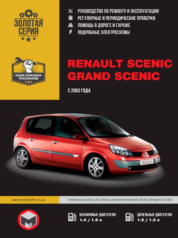 Руководство по ремонту Рено Сценик, а также руководство по техническому обслуживанию и эксплуатации, устройство автомобилей Renault Scenic с 2003 г. выпуска, оборудованных бензиновыми двигателями рабочим объемом 1,4 и 1,6 л., а также дизельными двигателями рабочим объемом 1,5, и 1,9 л.