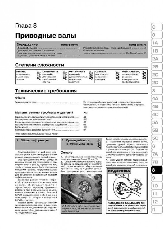 Так, в пособии есть отдельные главы, в которых подробно расписаны все виды работ с двигателем, автоматической и механической коробками передач, ходовой частью, рулевым управлением, тормозной системой, подвеской, кузовом и т.д.