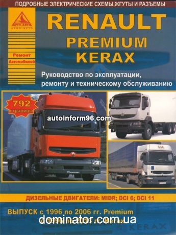 Пособие по ремонту Renault Premium / Kerax, а также инструкция по техническому обслуживанию и эксплуатации грузовых автомобилей Рено Премиум / Керакс, оснащенных дизельными двигателями MIDR, DCI 6, DCI 11. Рассматриваемые в книге автомобили Renault Premium выпускались в период с 1996 по 2006 гг., Renault Kerax – с 1996 по 2013 гг