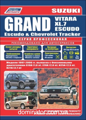 Руководство по ремонту Suzuki Grand Vitara, Grand Vitara XL.7, Grand Escudo, Escudo & Chevrolet Tracker & Mazda Proceed Levante 1997-2006 гг. выпуска, оборудованных бензиновыми двигателями: рядными 4-цилиндровыми G16A (1,6 л) и J20A (2,0 л), V-образными 6-цилиндровыми H25A (2,5 л) и H27A (2,7 л).